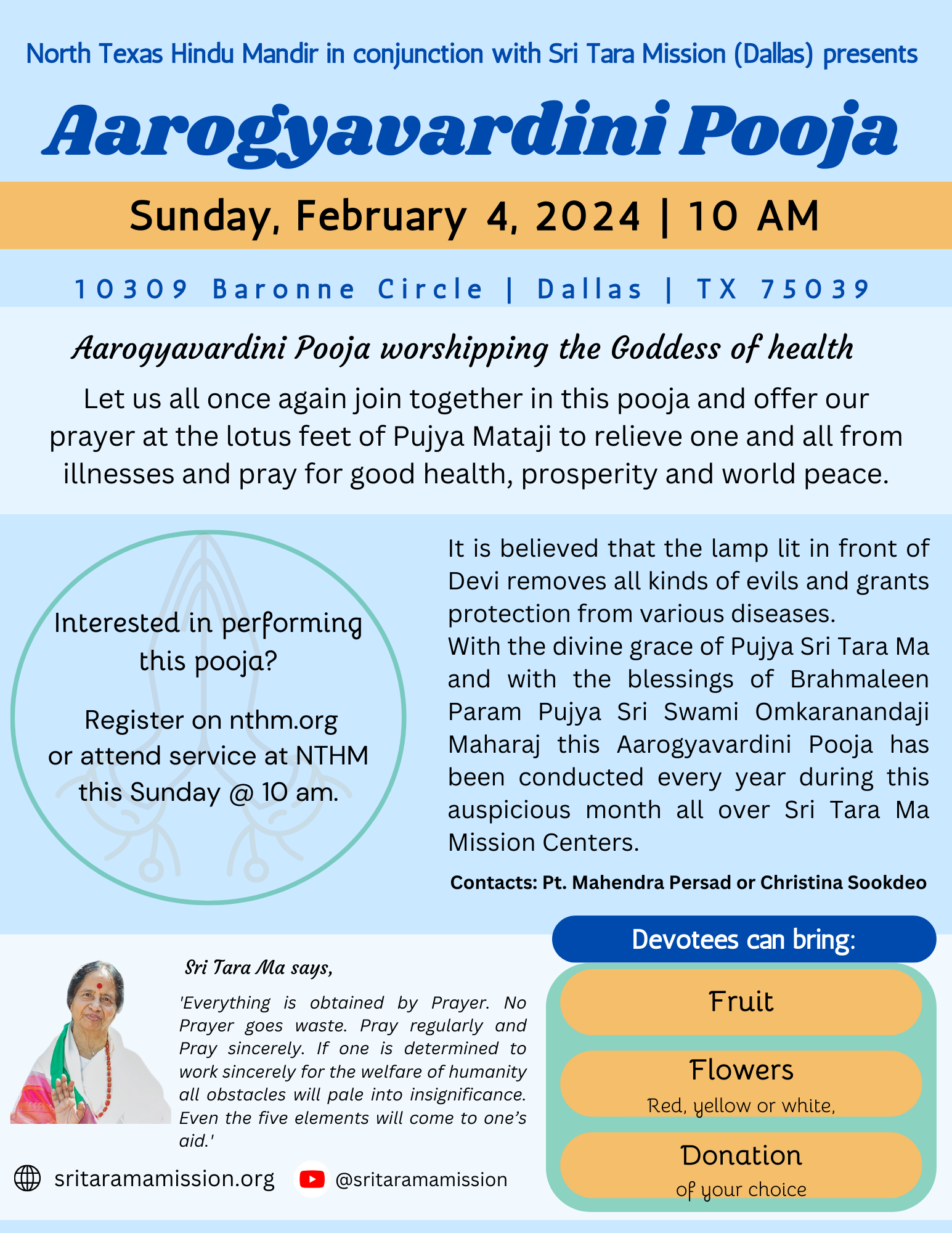 With the divine grace of Pujya Sri Tara Ma and with the blessings of Brahmaleen Param Pujya Sri Swami Omkaranandaji Maharaj this Aarogyavardini Pooja has been conducted every year during this auspicious month all over Sri Tara Ma Mission Centers.